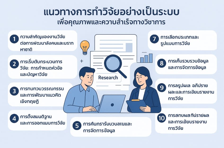 โดยสรุป การทำวิจัยที่มีคุณภาพและประสบความสำเร็จทางวิชาการจำเป็นต้องอาศัยทั้งความรู้ด้านระเบียบวิธีวิจัย การวิเคราะห์ข้อมูลอย่างเป็นระบบ และการเขียนเชิงวิชาการที่ถูกต้องตามมาตรฐาน ซึ่งในกระบวนการเหล่านี้ thesisdd.com ทำหน้าที่เป็นผู้ช่วยและที่ปรึกษาทางวิชาการอย่างมืออาชีพ ให้บริการด้านการรับทำวิจัยและให้คำปรึกษาครบทุกขั้นตอน ตั้งแต่การกำหนดหัวข้อ การทบทวนวรรณกรรม การออกแบบงานวิจัย การวิเคราะห์ข้อมูล ไปจนถึงการเรียบเรียงรายงานวิจัย วิทยานิพนธ์ และดุษฎีนิพนธ์ โดยยึดหลักจริยธรรม ความถูกต้อง และความน่าเชื่อถือเป็นสำคัญ จึงช่วยสนับสนุนให้นักศึกษาและนักวิจัยสามารถดำเนินงานวิจัยได้อย่างมีประสิทธิภาพ เสร็จสิ้นตามเป้าหมาย และยกระดับผลงานทางวิชาการให้ได้รับการยอมรับอย่างแท้จริง + รีวิวจากลูกค้า